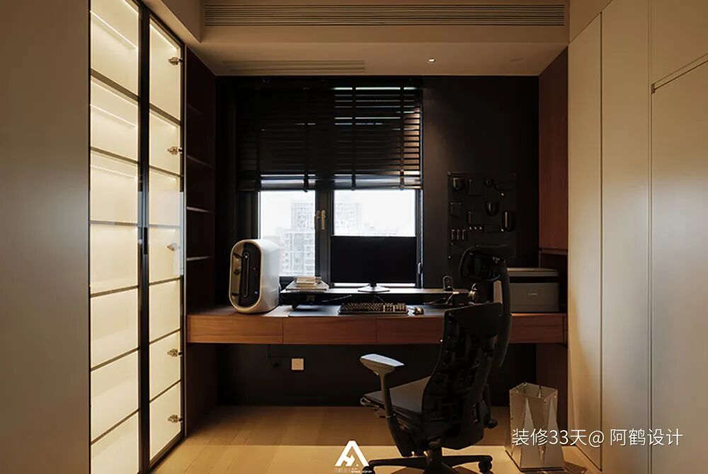 ▲ 多功能房,沿窗定制整排书桌区,右侧柜体巧妙嵌入上翻床,闲置时床体隐于柜中,需休憩时轻松翻下,秒变舒适睡眠区