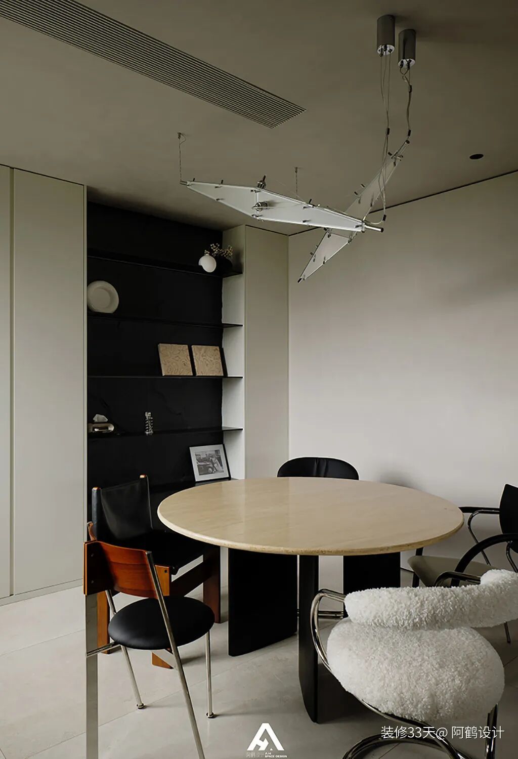 ▲ 餐厅,洞石餐桌搭配不同形态的中古单椅,上方点缀 Fragment 吊灯,整个用餐区氛围感拉满
