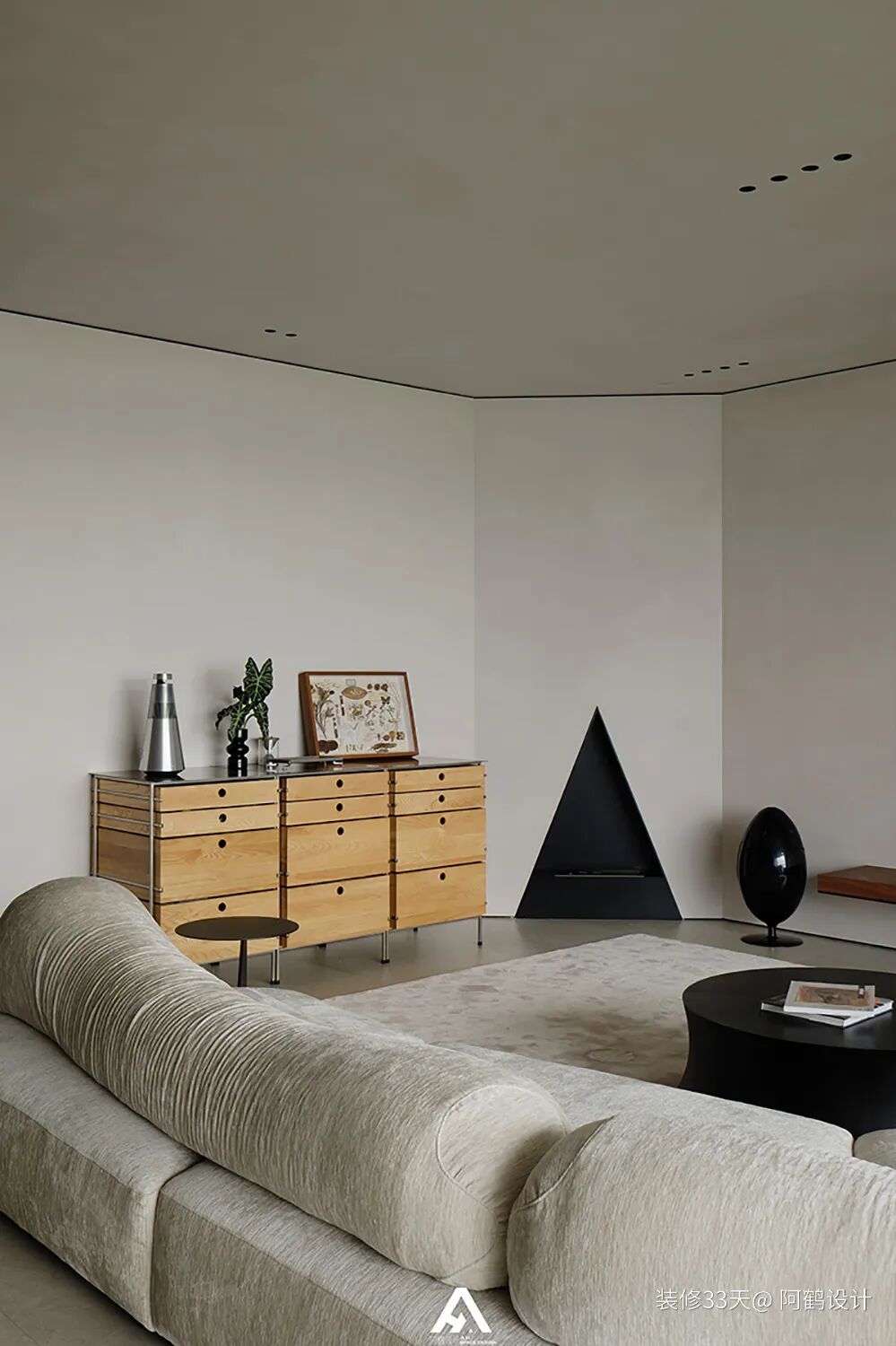 ▲ 充分利用客厅角落,设计三角形嵌入式壁炉,成为兼具设计感与氛围感的点睛之笔
