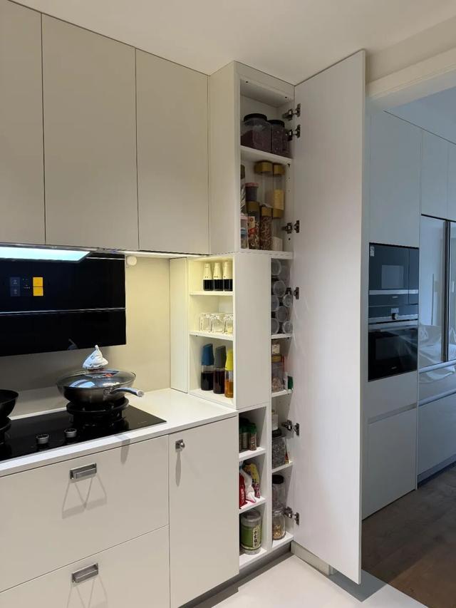 深度只有十来公分,但所有调料都能塞进去。柜门一关,干干净净。柜门一开,整整齐齐。拿取方便,还不占地方。