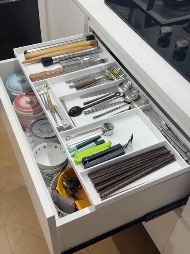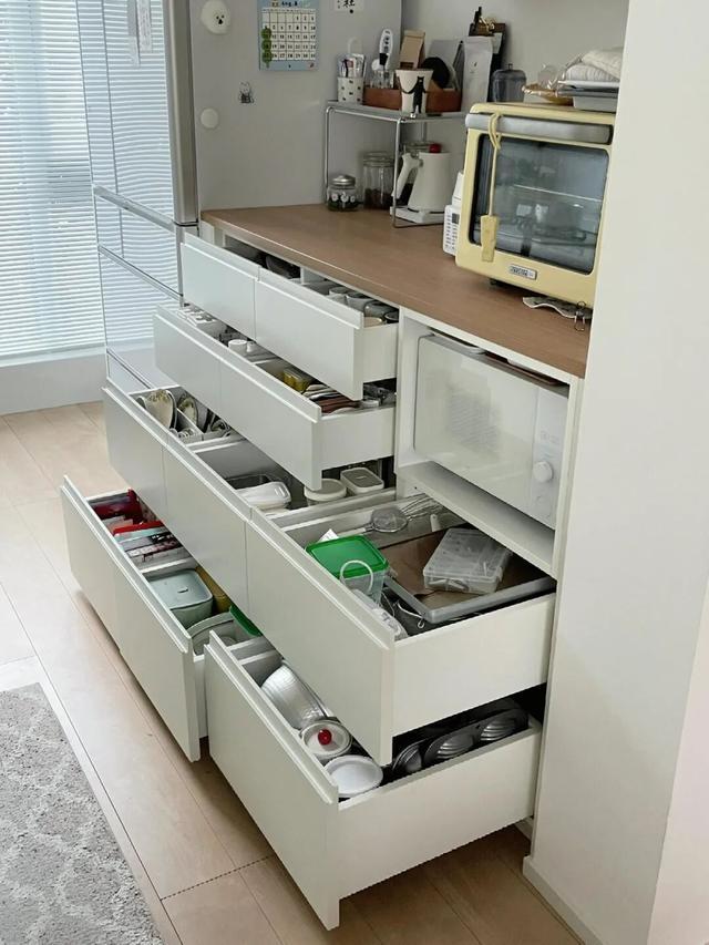 拉开抽屉,一目了然。锅碗瓢盆分门别类,想拿什么拿什么,不用把整个厨房翻个底朝天。
