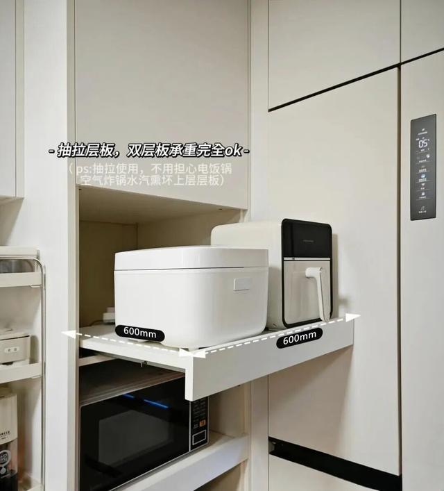 一层一层都是抽拉式的,每层背后预留插座,用的时候拉出来,不用的时候推回去。电饭煲煮饭不怕水蒸气,空气炸锅炸东西不占台面,整个厨房清清爽爽。