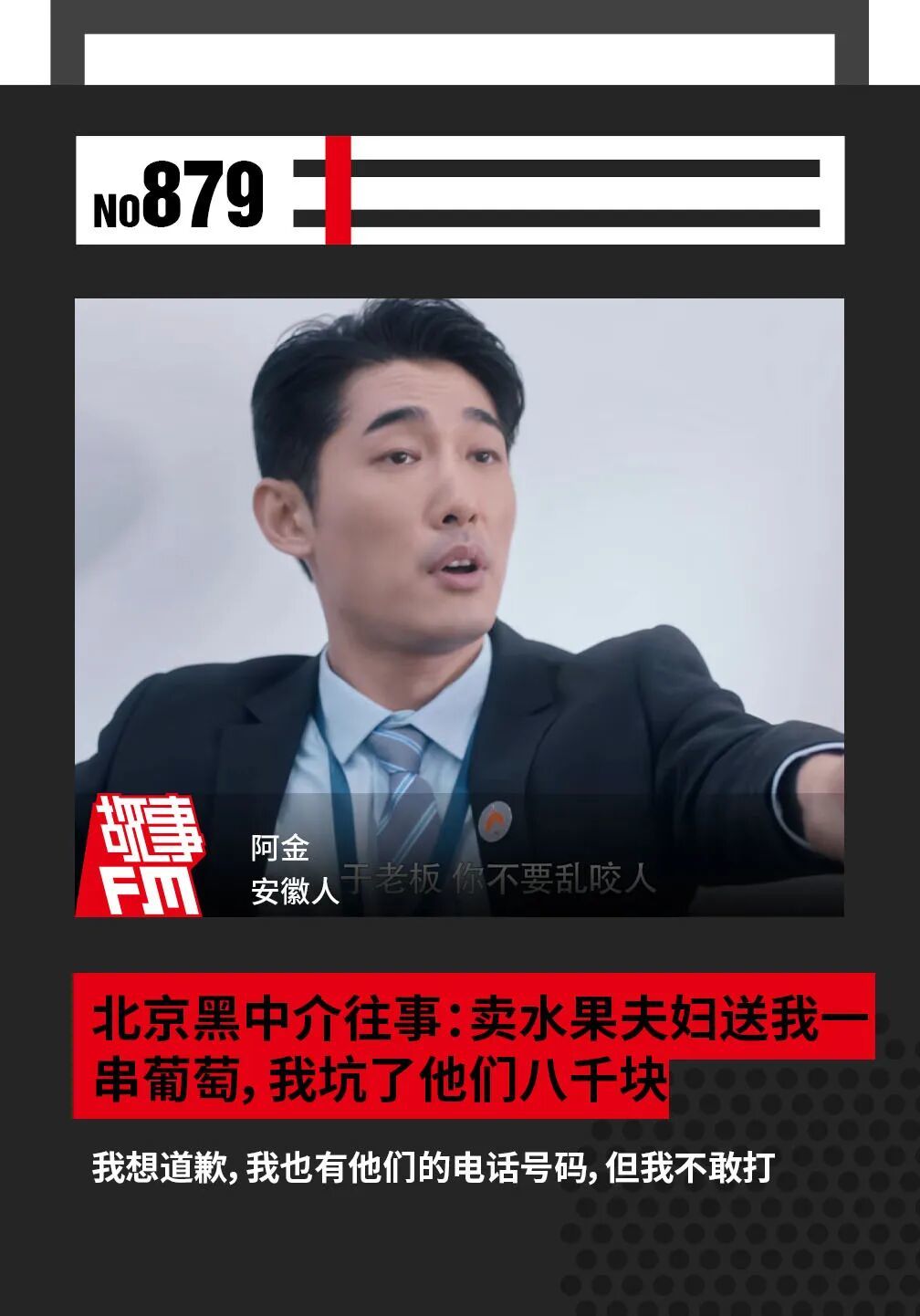 虽然在北京长大,但这些年他一直没什么来北京的想法和机缘。可就在他给我们投稿完不久,就像是冥冥之中的安排,阿金被单位派到北京出差。来我们录音室录节目的时候他才发现,当年做黑中介时的公司,就在 故事FM 录音室附近。
